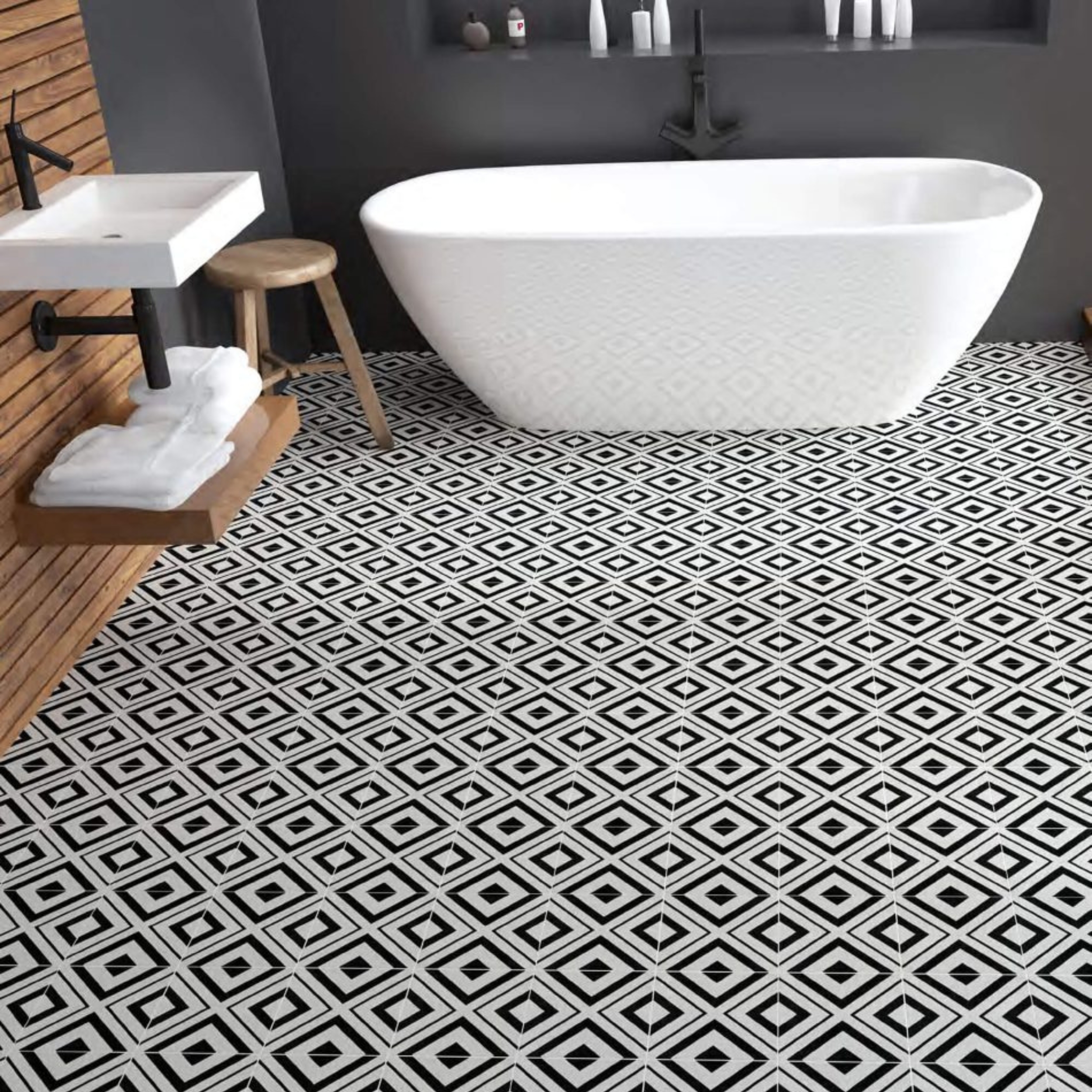Ce carrelage effet carreau de ciment apporte une touche décorative et rétro avec ses motifs graphiques et ses couleurs harmonieuses.